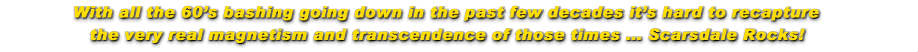 Forget about the stereotypes. These were the types glued to their stereos. In a town where money talked, some hated that they loved it, some just plain hated it. Scarsdale in the late '50s and into the '60s and '70s was a hard place to rock. It was like living on a movie set; part Frank Capra, part David Lynch. Is it any wonder that young dynamic rock and roll bands, steeped in irony and anti-establishment sentiment long before anyone ever heard of the words post-modern or angst, grew out of the ambiguities of ostentatious wealth on one hand and other-side-of-the-tracks morass on the other? The new site "Scarsdale Rocks" peels back some of the half-forgotten pages of history in the New York burbs for a view into the rec rooms, basements and garage band incubators that was mid-20th century youth culture in the eastern U.S. In a land of crazed week-end parties in the empty homes of the ruling class, this was the score. Whether you were there or not, whether you're 60 or 16, the sounds of the time will resonate. The audio files on "Scarsdale Rocks" slingshot ageless rebellion and periodic renaissance into the present. This was pre-indy indy. Some of it, the work of people your mother warned you about. Log-on. Tune-in. Drop-out. Scarsdale Rocks......really!